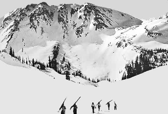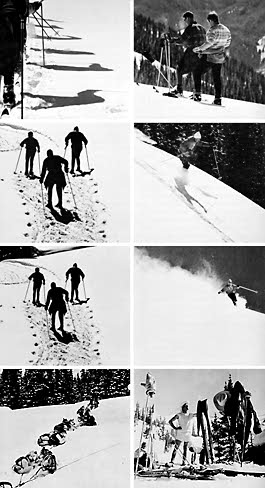 The tourers are there in full force too, adventuring into Montezuma and Pearl Basins, Mt. Hayden, into the Snowmass Wilderness and Taylor Pass, over to Cooper, Star and Italian Basins, bedding down at night in the Tagert and Lindley Memorial Huts or Stuart Mace's chalet which serves as his Huskie trip headquarters.