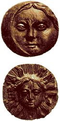 These beautiful round wooden faces of the moon and the sun were found in France by Mrs. Benedict's mother, poetess Mina Loy.